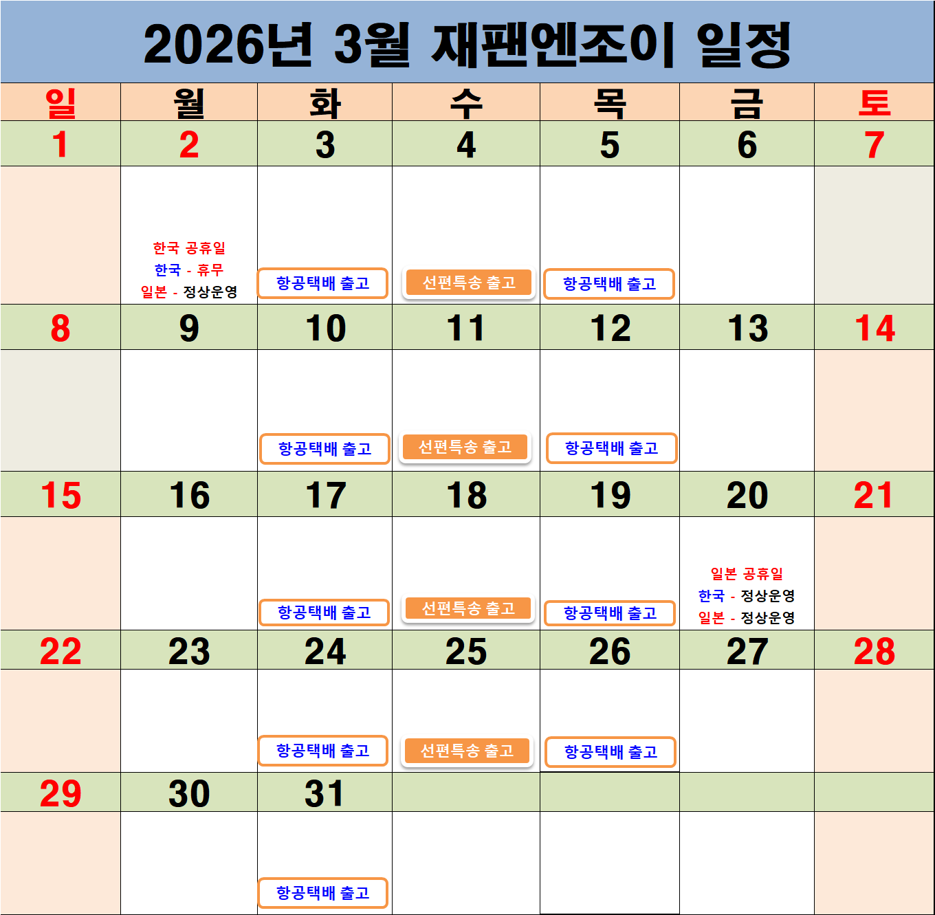 *항공택배편의 경우 3월 한달간 매주 화, 목요일 출고가 예정되어 있습니다 *선편특송편의 경우 3월 한달간 매주 수요일 출고가 예정되어 있습니다